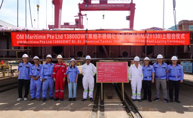 7月25日上午9時(shí)58分,新江洲船舶重工有限責(zé)任公司為新加坡船東OM Maritime海運(yùn)私人有限公司建造的首艘13800DWT不銹鋼化學(xué)品船(船號(hào)NJZ1138)在公司301室外船臺(tái)舉行上船臺(tái)儀式。